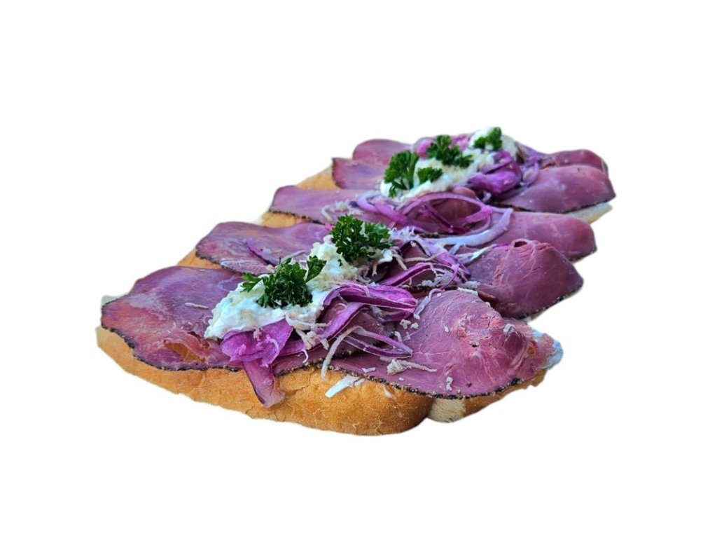 Chlebíček se šunkou à la rosbíf, doplněný o červenou cibulku, majonézu a čerstvě strouhaný křen. Připravený čerstvě na objednávku z nadýchané veky z lokální tradiční řemeslné pekárny.